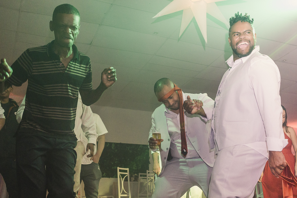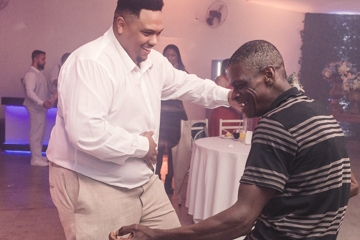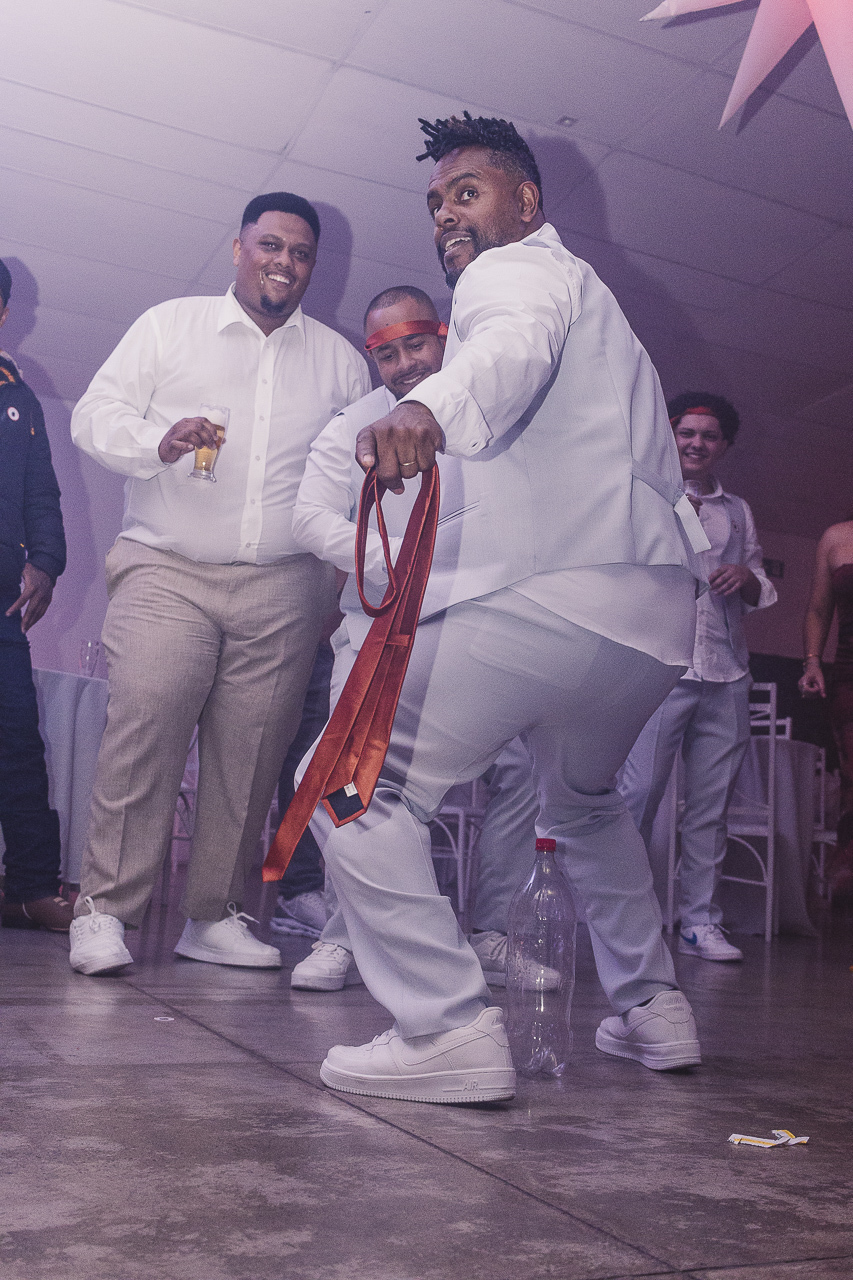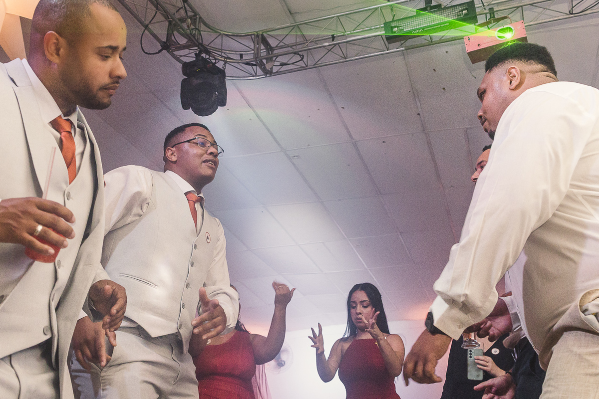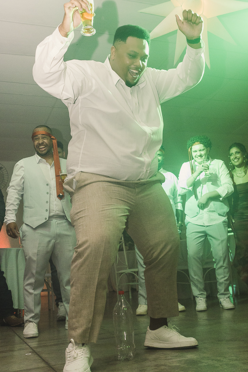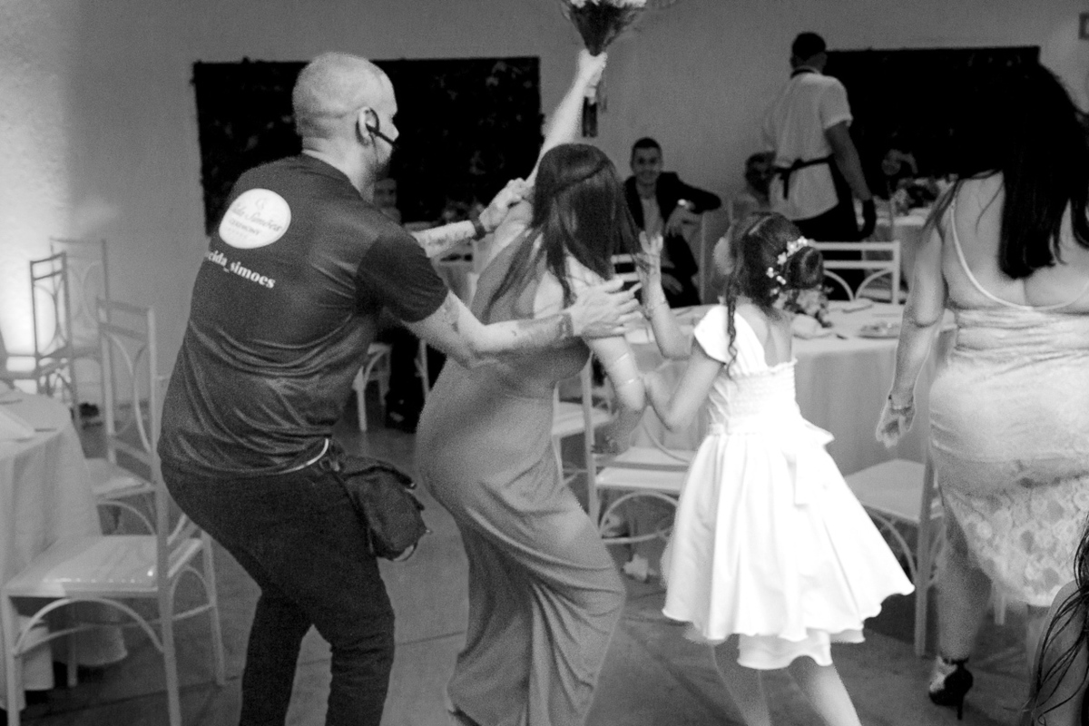 E quando a festa começou ninguém conseguiu ficar parado. Padrinhos e madrinhas transformaram a pista em palco. Os pais dos noivos foram protagonistas: o pai da noiva arrasou no break e o pai do noivo, mesmo recém-saído do hospital, dançou até o último minuto.
