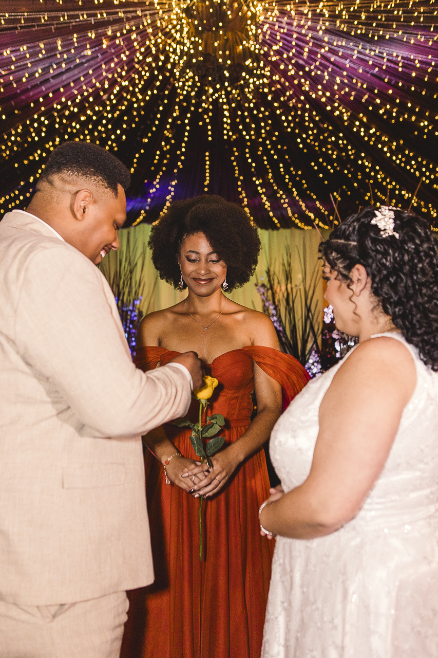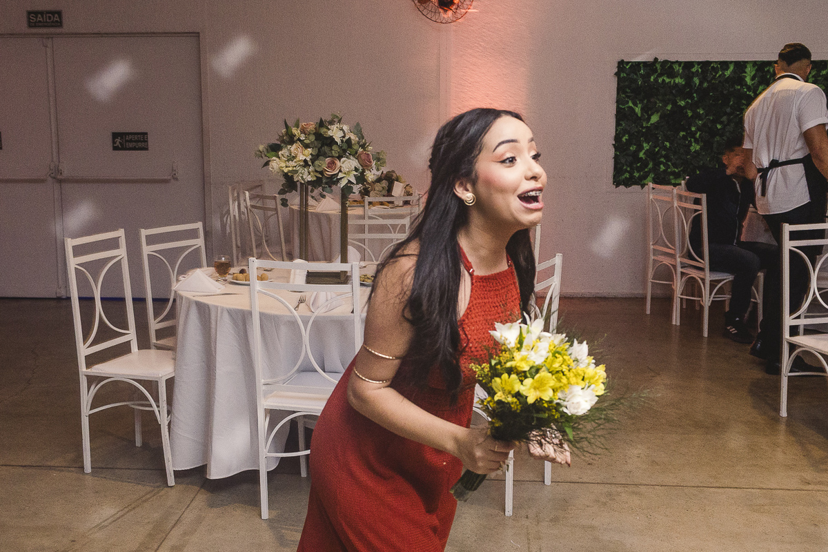 No último sábado, na Mansão Ilha de Capri, esse amor ganhou novos votos e testemunhas. A cerimônia foi um retrato da essência deles: leve, divertida e cheia de emoção. As madrinhas entraram com rosas amarelas, criando um corredor de flores vivas e luminosas. Os padrinhos, com sua alegria, deram o tom de festa.