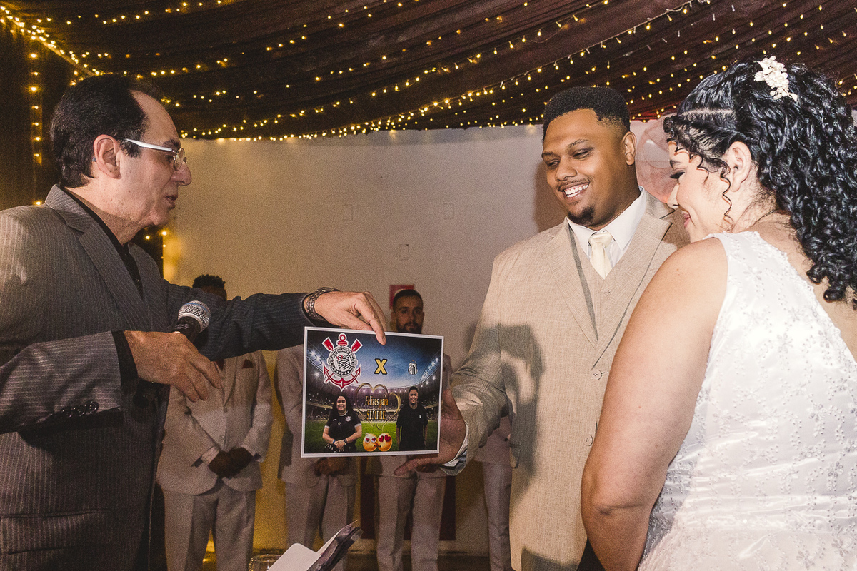 Entre rivalidades de Corinthians e Santos, o mestre de cerimônia fez questão de unir as paixões em um presente simbólico, lembrando que no fim, o amor é o time onde os dois torcem juntos.