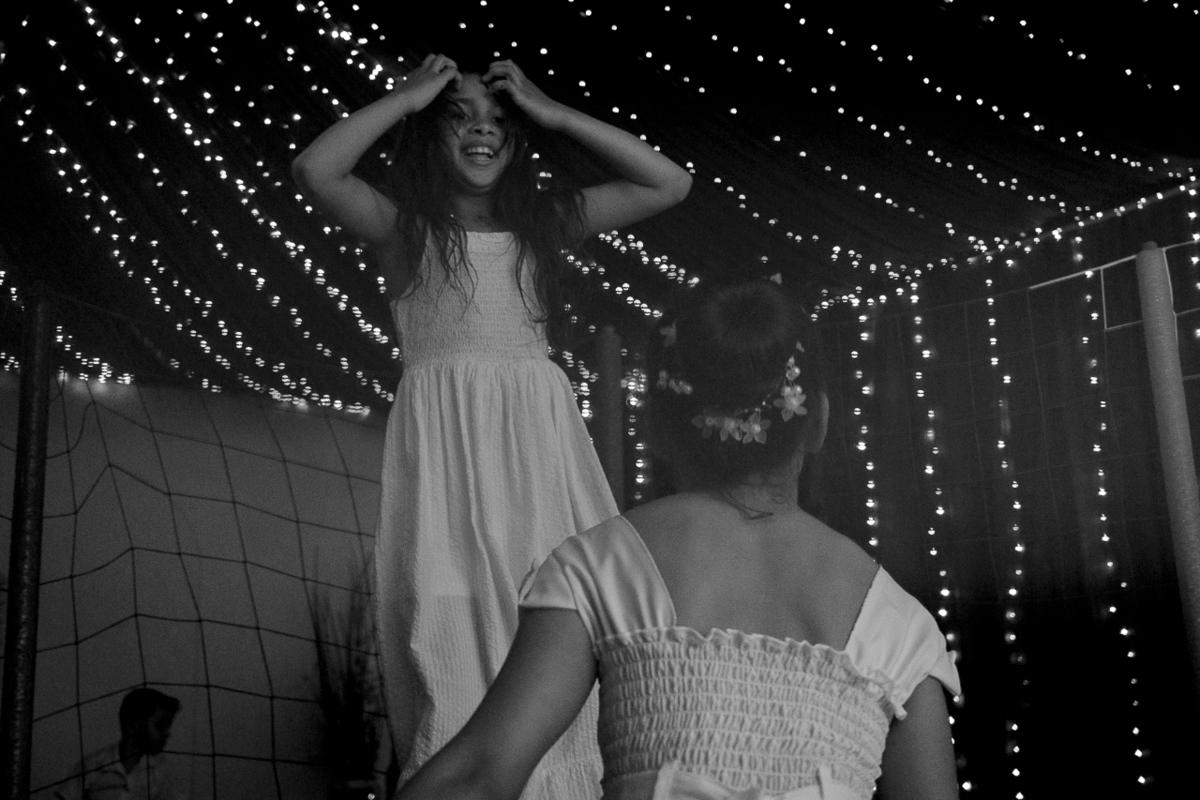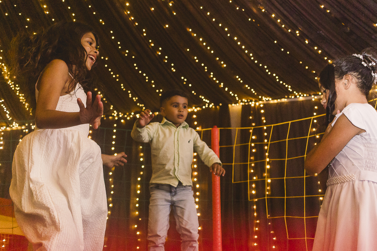 E não foram só os adultos que brilharam. As crianças tiveram um espaço pensado para elas, com brinquedos que fizeram a alegria dos pequenos convidados. Risadas na área dos brinquedos enquanto, na pista, os adultos se divertiam sem parar. Foi um casamento para todas as idades — uma verdadeira celebração da família.